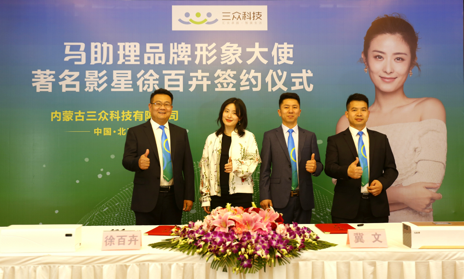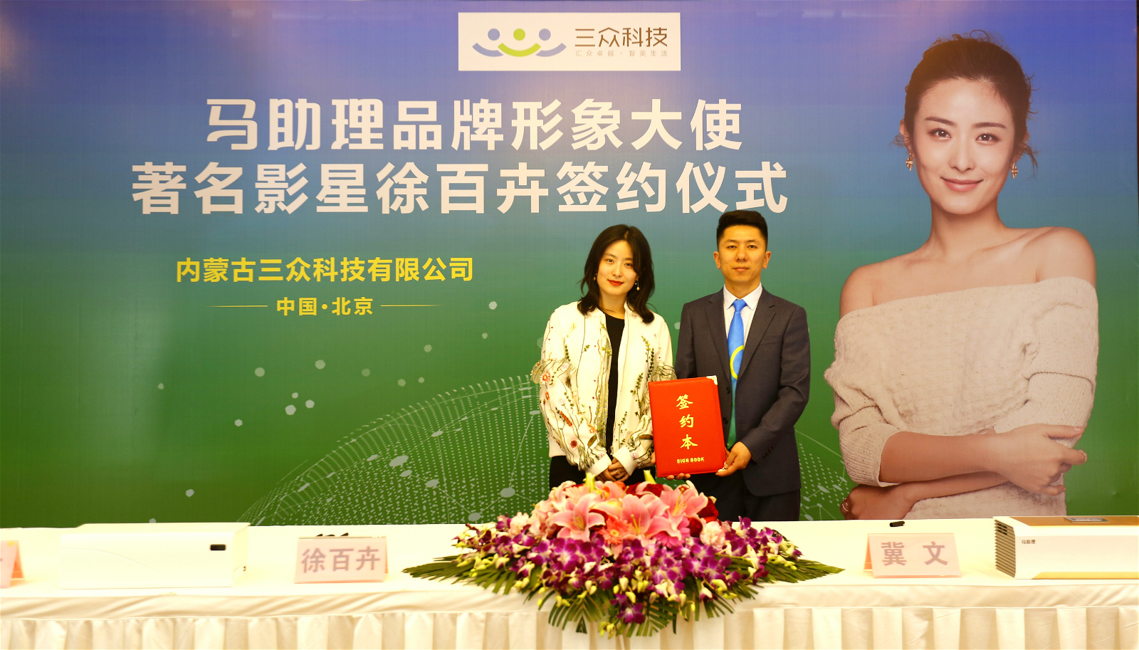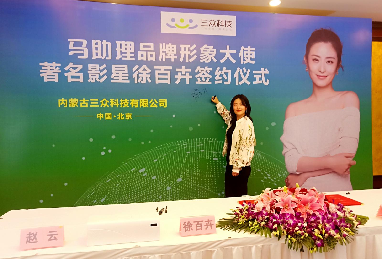 2019年4月22日,“馬助理品牌形象大使徐百卉簽約儀式”在北京鵬潤(rùn)國(guó)際大酒店隆重舉行。內(nèi)蒙古三眾科技有限公司聯(lián)合創(chuàng)始人、董事長(zhǎng)冀文先生、聯(lián)合創(chuàng)始人、總經(jīng)理趙云先生、聯(lián)合創(chuàng)始人、副總經(jīng)理孫凱先生、著名影星徐百卉等嘉賓及多家媒體出席本次簽約儀式。簽約現(xiàn)場(chǎng)氣氛熱烈,本次活動(dòng)取得了圓滿成功。