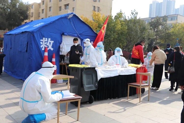 呼和浩特市連夜開展第一輪核酸檢測準備工作。核酸檢測工作人員夜以繼日,爭分奪秒;志愿者們紛紛加入,盡己所能;社區工作人員堅守崗位,盡心竭力;各個小區里、村鎮里、學校里都排起了長長的隊伍。